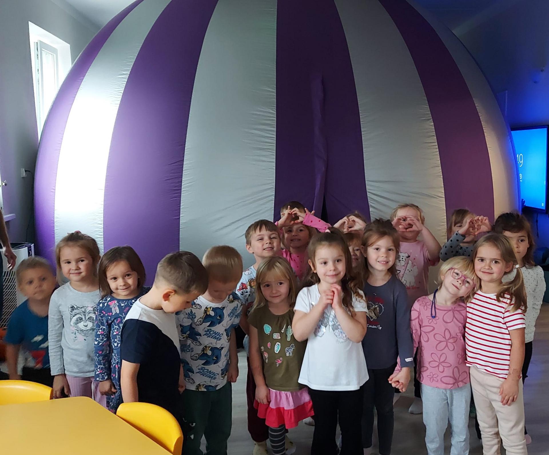 3 listopada w naszym przedszkolu gościło mobilne kino sferyczne. W jednej z sal pojawiła się ogromna kopuła, która zamieniła się w niezwykłą przestrzeń edukacyjną. Dzieci ze wszystkich grup kolejno uczestniczyły w seansie „Magiczny Globus”, który przeniósł je w fascynujący świat astronomii i przyrody. Fabuła filmu skupiała się na tajemnicach pór roku i zmianach zachodzących na Ziemi w ich trakcie. Dzieci dowiedziały się także, jak przyroda i zwierzęta przystosowują się do tych zmian. Było to niezwykłe doświadczenie, pełne kolorów, dźwięków i emocji, które na długo pozostanie w pamięci naszych przedszkolaków.